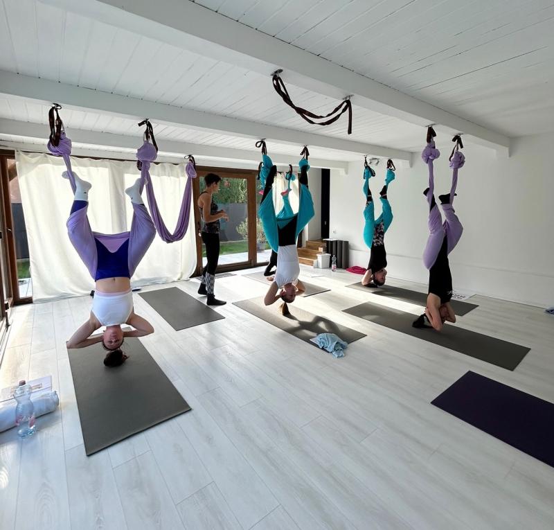 - Aerial gyakorlat: A tanfolyam előtt ajánlott kb. 5-10 Aerial Yoga órán résztvenni.