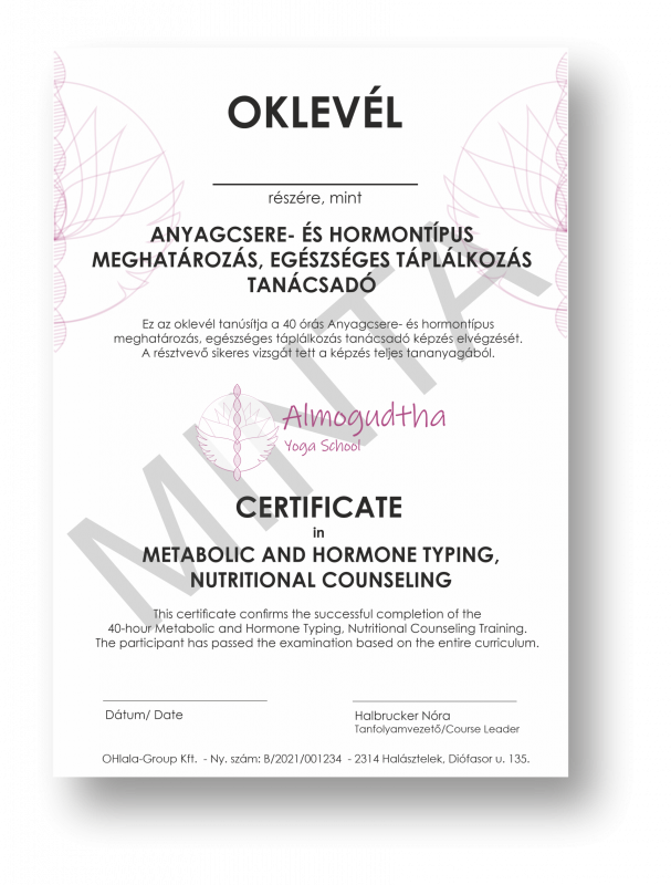 ✅ A képzés a magyar oktatási törvénynek megfelelő felnőttképzésnek minősül, így felnőttképző tanúsítványt kapsz ha levizsgáztál. Ezenkívül az Almogudtha Yoga School által kiállított oklevelet is megkapod. Mindkettőn “Anyagcsere- és hormontípus meghatározás, egészséges táplálkozás tanácsadó” szerepel.